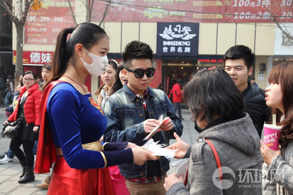 一年一度的正月十五元宵节,很多人都会选择精美的佳肴珍馐馈赠亲友。西安华都巧雅妇科医院则在这一天为大家送上健康。年轻貌美的姑娘们装扮成的女超人们,在东大街骡马市和南门为路人送上过滤PM2.5型口罩。虽然我们不能像超人一样飞天遁地百毒不侵。但我们可以从细节入手保卫自身健康。虽然不能改变世界,但我们可以戴上口罩来保护自己的呼吸系统。
